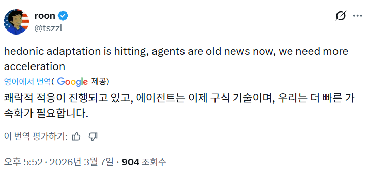 “쾌락 적응이 시작되고 있다. 이제 에이전트는 이미 식상한 이야기가 되었고, 우리는 더 빠른 가속이 필요하다.”