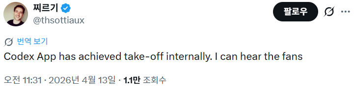 "Codex 앱이 내부적으로 본격적인 궤도에 올랐습니다. 팬 소리가 들릴 정도네요."