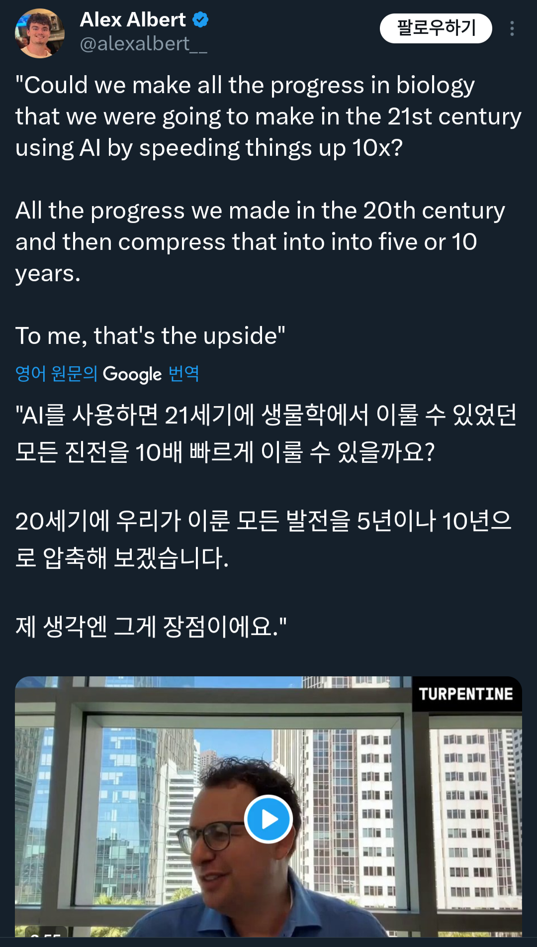 - 생물학 분야에서 20세기에 이룬 모든 진보를 AI를 통해 5-10년 안에 압축적으로 이룰 수 있을 것으로 전망