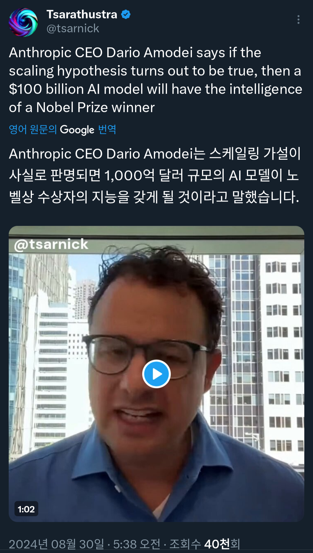 다리오 아모데이 " 1000억 달러 규모의 모델은 노벨상 수상자 수준의 지능이 될 것"